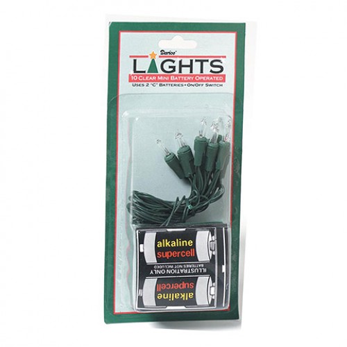 Strand of ten clear lights (green cord) that work on 2 "C" Batteries (not included).